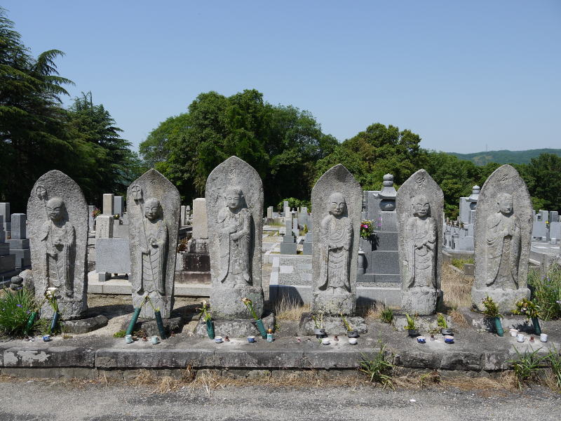 お地蔵さん 石仏で最も多いもののひとつが地蔵石仏です。街道沿いや村の入り口などに地蔵屋形があります。地蔵盆に開帳して供物を子供たちに配る習慣は今でもあります。空襲で焼け野原になった大都市でも地蔵屋形は復活しています。ほとんどの墓地には六地蔵およびお迎え地蔵があります。六地蔵は人間が六道(地獄道〜天道)輪廻転生する間それぞれの世界で救済してくれる仏と考えられています。浄土衆では三途の川のほとりに六地蔵が居られて一文ずつお供えをすると三途の川を渡ることが出来ると考えられて、死者に冥土の土産に六文銭をもたせる風習がありました。金勝寺墓地の六地蔵は不揃いですが平群でも一番大きいと思います。平群図書館の横に郵便ポストと並んで地蔵の屋形が有ります。福貴村の東入り口に当たり、村に災いが入らないようにとの祈りが込められているのではないでしょうか。久安寺の地蔵立像は小字久保の西入口にあたります。 |